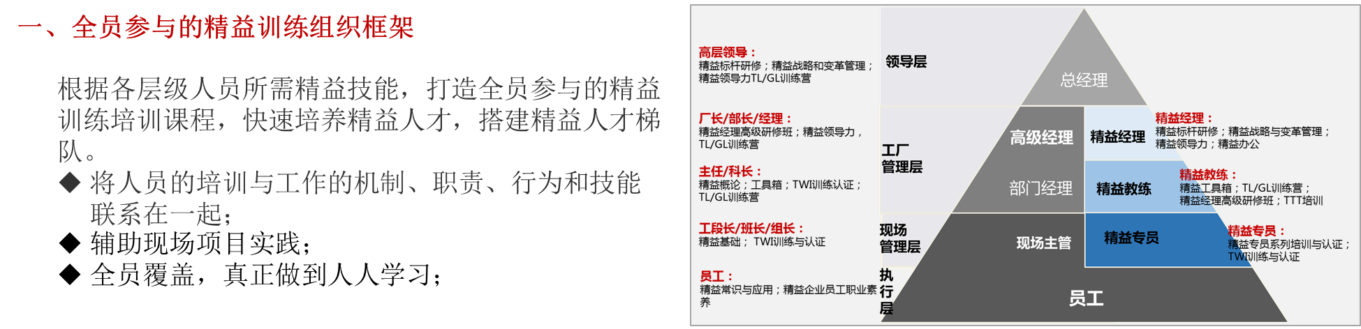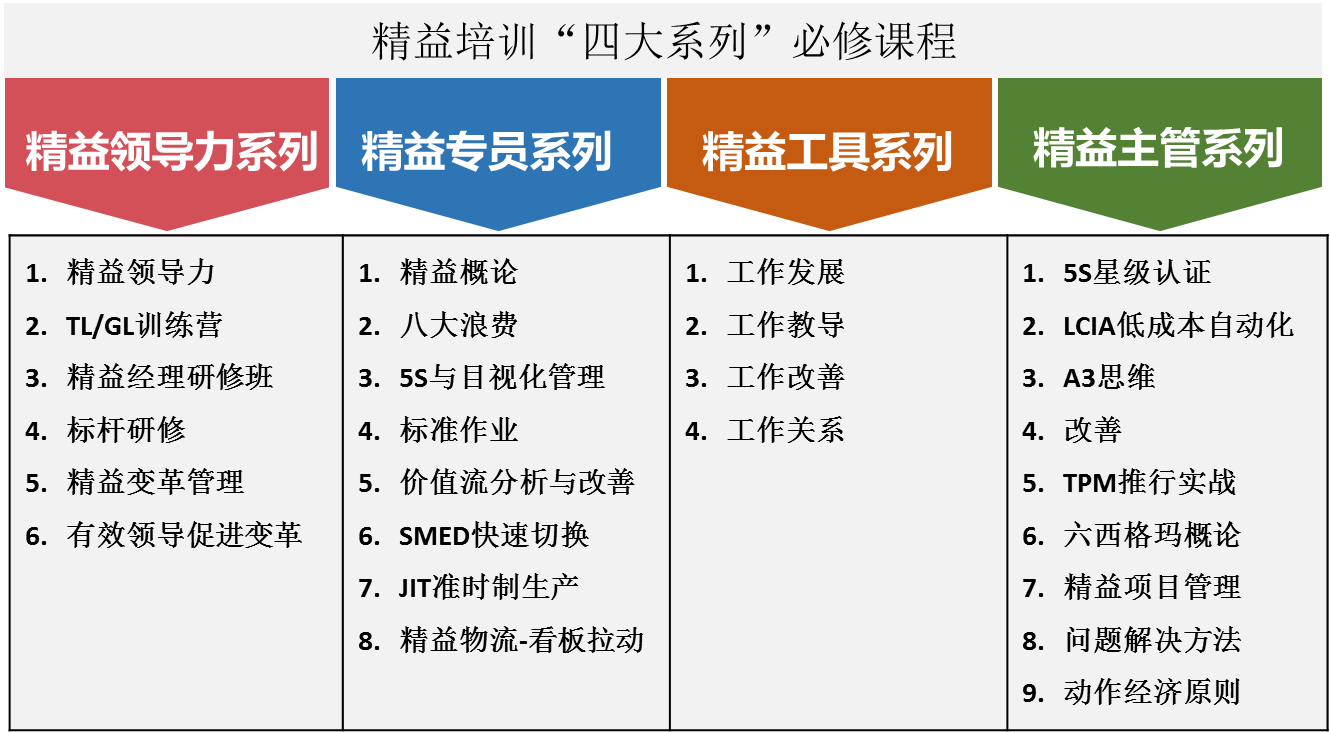 戴明精益管理培訓(xùn)“四大系列”必修課程是企業(yè)推動(dòng)精益轉(zhuǎn)型過程中必修的精益理念、工具、系統(tǒng)和變革能力,戴明咨詢?yōu)槠髽I(yè)提供行業(yè)的精益實(shí)戰(zhàn)必修課程,為企業(yè)內(nèi)部選擇和開發(fā)課程節(jié)約時(shí)間,并確保企業(yè)獲得高質(zhì)量的精益培訓(xùn)資料,為企業(yè)快速培養(yǎng)精益人才,搭建精益人才梯隊(duì)。